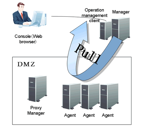 If communications between Managers and Agents (including Proxy Managers) is restricted, such as in Internet environments, the "Pull" method can be used instead of the "Push" method, as shown in the figure above.