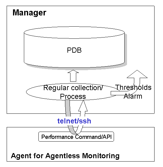Communication is performed between the monitoring server and monitored server (agent for Agentless Monitoring) by one of telnet, ssh or https when remotely collecting performance information. Refer to Chapter 3, "Management with an Agent for Agentless Monitoring" in the User's Guide for details on conditions and settings.