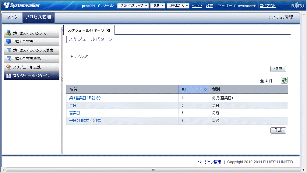 [プロセス管理]タブの[スケジュールパターン]サブメニューをクリックし、[作成]ボタンをクリックして、新規のスケジュールパターンを作成します。