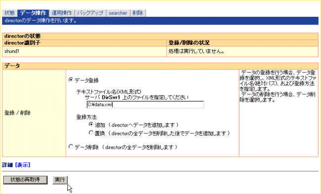 右フレームで[データ操作]タブを選択し、各項目を入力後「実行」ボタンをクリックします。