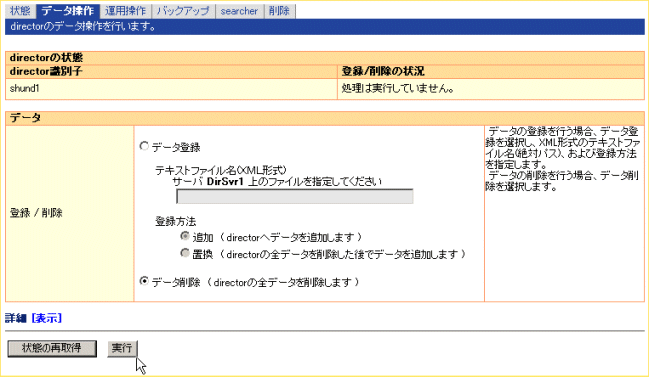 右フレームで[データ操作]タブを選択後、ラジオボタンで「データ削除」を選択し、「実行」ボタンをクリックします。