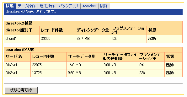 右フレームで[状態]タブを選択後、「状態の再取得」ボタンをクリックし、searcher状態のサーチデータ量、フラグメンテーション率またはサーチデータファイルの使用量を確認します。