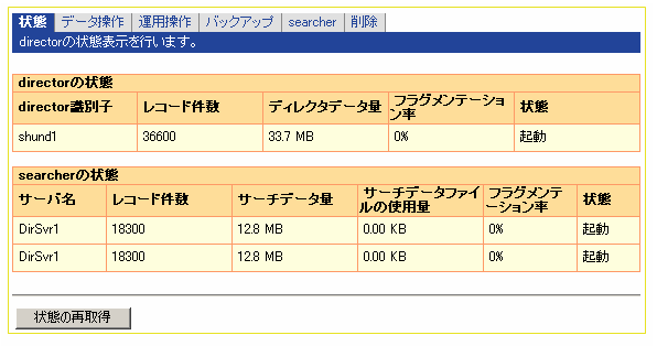 サーチデータ量、フラグメンテーション率およびサーチデータファイルの使用量の情報は、directorまたはsearcherの状態確認から参照できます。