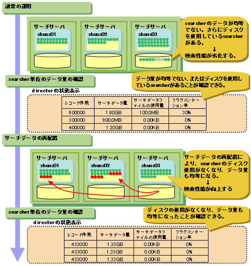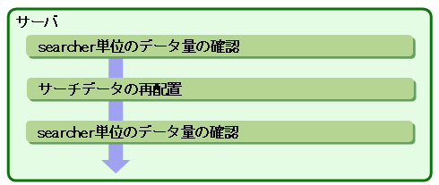 データの削除やsearcherの増設または縮退などにより、searcherごとのデータ量やサーチデータファイルのデータ量に偏りが大きくなった場合は、サーチデータの再配置が必要になります。