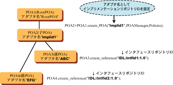 次に、子POAオブジェクトのさらに子POAオブジェクト(孫POA:POA3、POA4)は、インタフェースリポジトリIDをアダプタ名に指定して生成します。