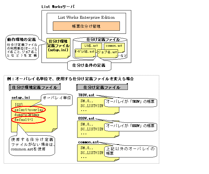 帳票仕分け管理機能の動作環境は、「仕分け環境定義ファイル」で定義します。仕分け条件は、「仕分け定義ファイル」で定義します。どちらのファイルも、テキストエディタなどで作成し、仕分け元のList Worksサーバに格納します。