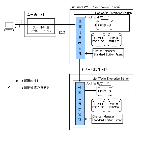 富士通ホスト帳票を扱う場合のファイル転送運用について、システム構成を以下に示します。