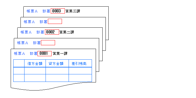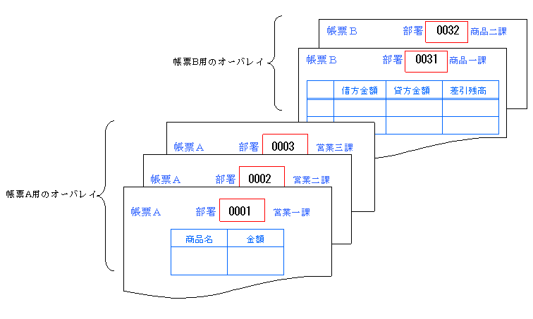 例:1つの帳票に、帳票A用のオーバレイと帳票B用のオーバレイが使用されていて、それぞれの帳票に「部署コード」がある場合