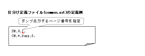 ここでは、ダンプ出力機能を使用するのに必要な定義内容だけを、説明しています。以下は、仕分け環境定義ファイルのselect文に「common」を指定し、仕分け定義ファイルを「common.ast」とする例です。