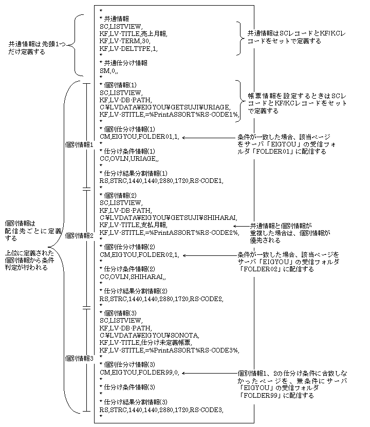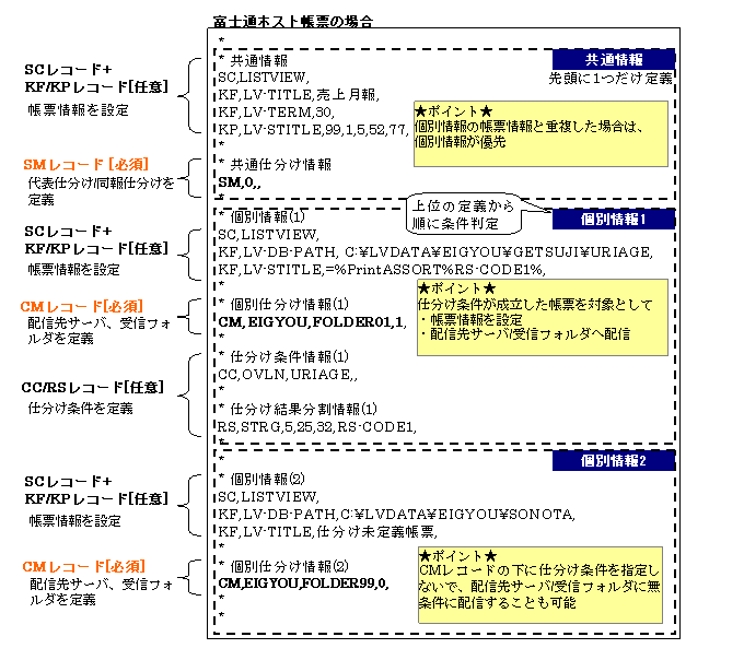 帳票情報や仕分け条件、仕分け先などを定義します。個別情報には、仕分け先を指定するCMレコードを必ず定義します。1つの仕分け定義ファイルには、最大10000の個別情報を定義できます。