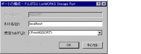 【ポートの構成】ダイアログボックスで、ホスト名に「localhost」を指定し、受信フォルダ名に「<PrintASSORT>」を選択し、【OK】ボタンをクリックします。