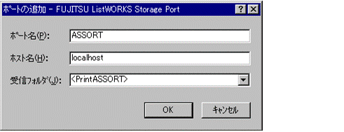 【ポートの追加】ダイアログボックスで、「ポート名」にポート名、ホスト名に「localhost」を入力し、受信フォルダ名に「<PrintASSORT>」を選択し、【OK】をクリックします。