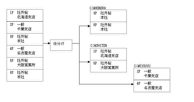 SM,0,0, * *個別情報1 *文字列が「社外秘」かつ「本社」であるページを本社用フォルダへ格納 SC,LISTVIEW, KF,DB-PATH,C:\HONSYA, CM,*,lwprt,2, CC,STRL,社外秘,3,, CC,STRL,本社,5,&, * *個別情報2 *文字列が「社外秘」かつ「本社」以外であるページを支店用フォルダへ格納 SC,LISTVIEW, KF,DB-PATH,C:\SHITEN, CM,*,lwprt, 2, CC,STRL,社外秘,3,, CC,NSTRL,本社,5,&, * *個別情報3 *その他のページを共用フォルダへ格納 SC,LISTVIEW, KF,DB-PATH,C:\KYOUYOU, CM,*,lwprt,1, CC,ELSE,,
