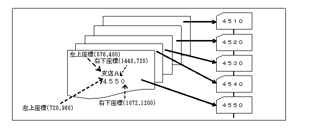 タイトル:左上座標(1296,960)、右下座標(7344,1200) コメント:左上座標(7344,960)、右下座標(11088,1200) 支店名 :左上座標(576,480)、右下座標(1440,720) 帳票種別:左上座標(720,960)、右下座標(1872,1200)