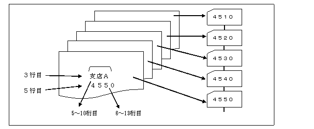 タイトル:5行の10~51桁目 コメント:5行の52~77桁目 支店名 :3行の5~10桁目 帳票種別:5行の6~13桁目