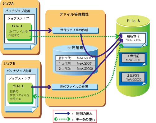 ファイルの世代管理機能は、バッチアプリケーションが実行時に作成するファイル資源のバックアップを保存し、ファイルの世代を管理します。