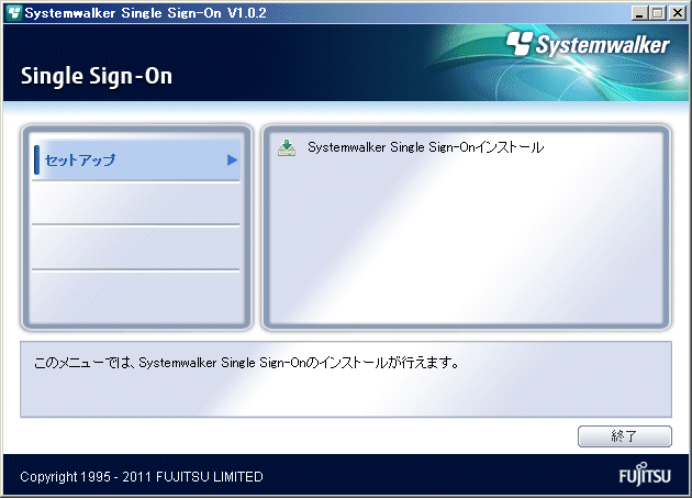 =========================================================================== Systemwalker シングル・サインオンサーバ セットアップ V1.0.2 All Rights Reserved, Copyright(c) FUJITSU LIMITED 1995 - 2011 =========================================================================== Systemwalker シングル・サインオンサーバセットアップへようこそ!! セットアップは、Systemwalker シングル・サインオンサーバをインストールします。 リターンキーを押してください。
