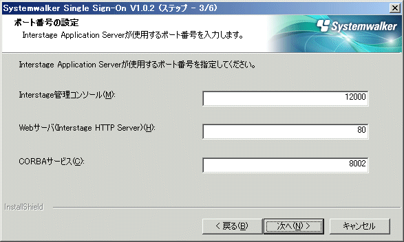 =========================================================================== Systemwalker シングル・サインオンサーバ セットアップ V1.0.2 All Rights Reserved, Copyright(c) FUJITSU LIMITED 1995 - 2011 =========================================================================== << ポート番号の指定 >> Interstage管理コンソール : 12000 Webサーバ(Interstage HTTP Server) : 80 CORBAサービス : 8002 ---------------------------------------------------------------------------- ポート番号を指定してください。 Interstage管理コンソール(初期値: 12000) [?,q] ==> 12001 Webサーバ(Interstage HTTP Server)(初期値: 80) [?,q] ==> 8080 CORBAサービス(初期値: 8002) [?,q] ==> 8003