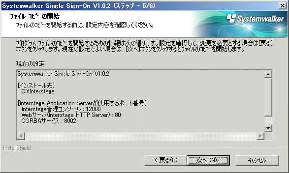 =========================================================================== Systemwalker シングル・サインオンサーバ セットアップ V1.0.2 All Rights Reserved, Copyright(c) FUJITSU LIMITED 1995 - 2011 =========================================================================== << ポート番号の指定 >> Interstage管理コンソール : 12001 Webサーバ(Interstage HTTP Server) : 8080 CORBAサービス : 8003 ---------------------------------------------------------------------------- 上記の設定を変更しますか?(初期値: n ) [y,n,?,q] ==> n