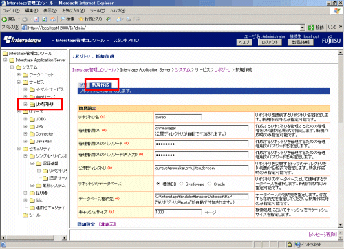 [Interstage 管理コンソール]画面で、[システム]-[サービス]-[リポジトリ]-[新規作成]タブを選択します。