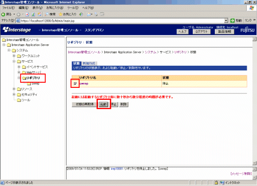 [Interstage 管理コンソール]画面で、作成したSystemwalker認証リポジトリのチェックボックスをチェックし、[起動]ボタンを選択します。