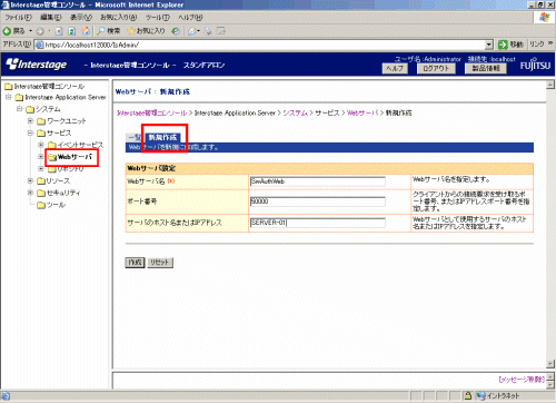 2. [Interstage 管理コンソール]画面で、[システム]-[サービス]-[Webサーバ]-[新規作成]タブを選択します。