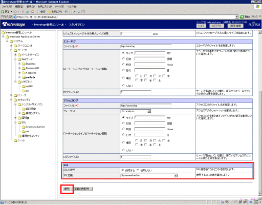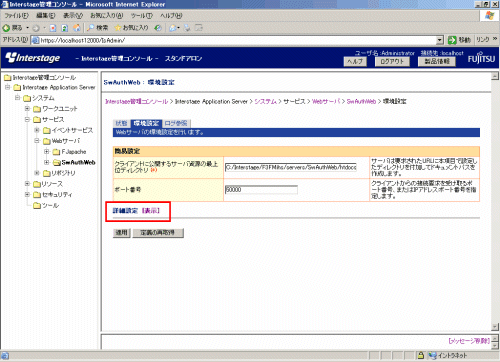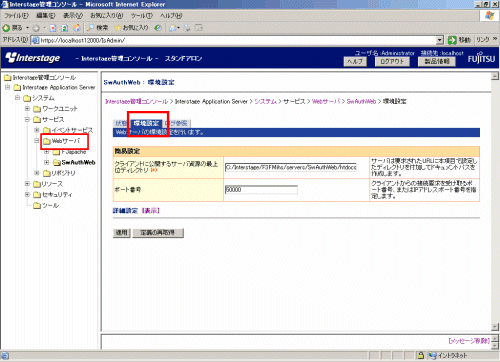 4. [Interstage 管理コンソール]画面で、[システム]-[サービス]-[Webサーバ]-[Webサーバ名(注)]-[環境設定]タブを選択します。