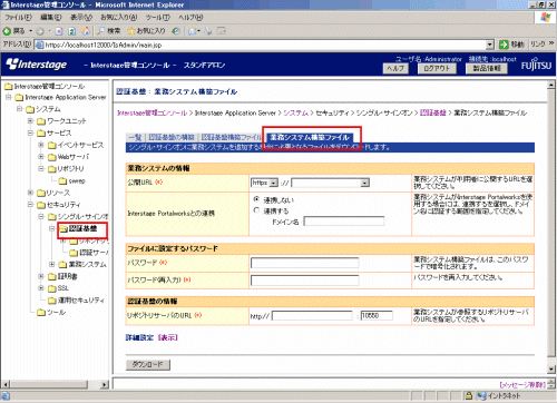15. [Interstage 管理コンソール]画面で、[システム]-[セキュリティ]-[シングル・サインオン]-[認証基盤]-[業務システム構築ファイル]タブを選択します。