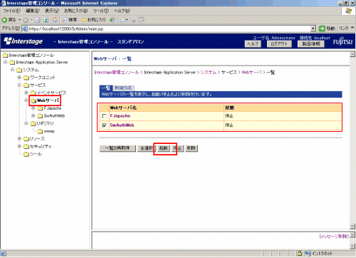 21. [Interstage 管理コンソール]で、[システム]-[サービス]-[Webサーバ]を選択します。