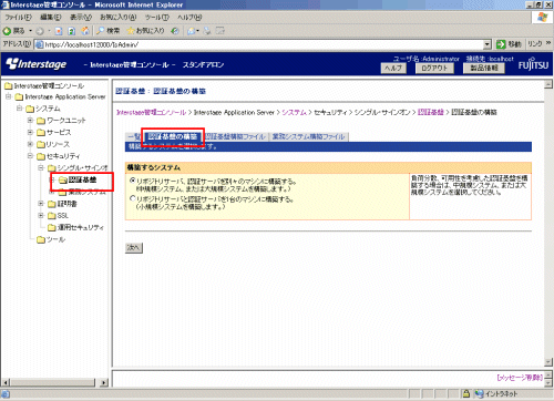 2. [Interstage 管理コンソール]画面で、[システム]-[セキュリティ]-[シングル・サインオン]-[認証基盤]-[認証基盤の構築]タブを選択します。