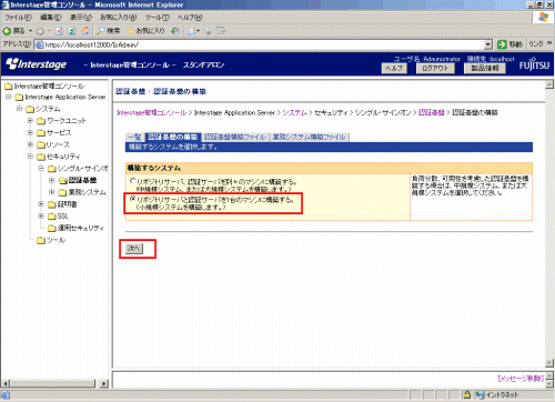 3. [Interstage 管理コンソール]画面で[リポジトリサーバと認証サーバを1台のマシンに構築する。]を選択し、[次へ]ボタンを選択します。