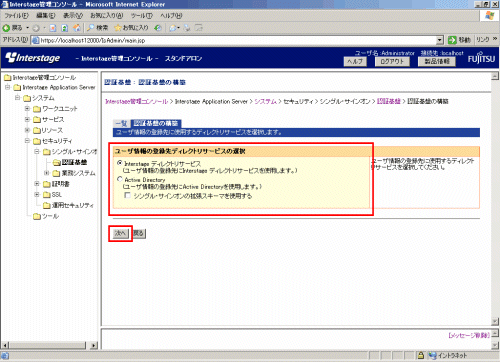 4. [Interstage 管理コンソール]画面で共通ユーザー情報格納先ディレクトリサービスを選択し、[次へ]ボタンを選択します。