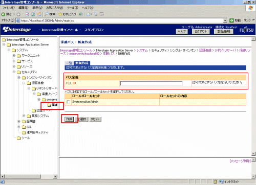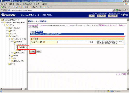 12. [Interstage 管理コンソール]で、[システム]-[セキュリティ]-[シングル・サインオン]-[認証基盤]-[リポジトリサーバ]-[保護リソース]-[FQDN:ポート番号]-[保護パス]-[新規作成]タブを選択します。