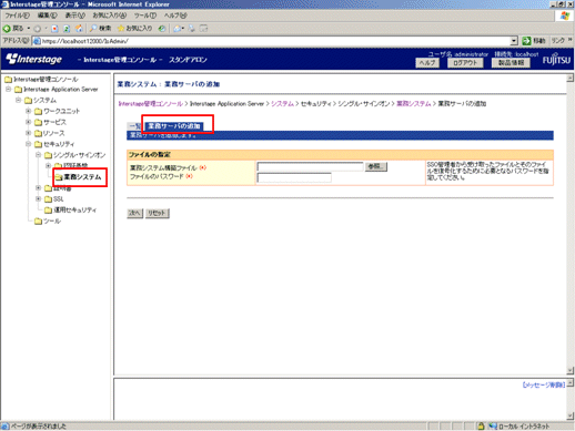 [Interstage 管理コンソール]画面で[システム]-[セキュリティ]-[シングル・サインオン]-[業務システム]-[業務サーバの追加]タブを選択します。