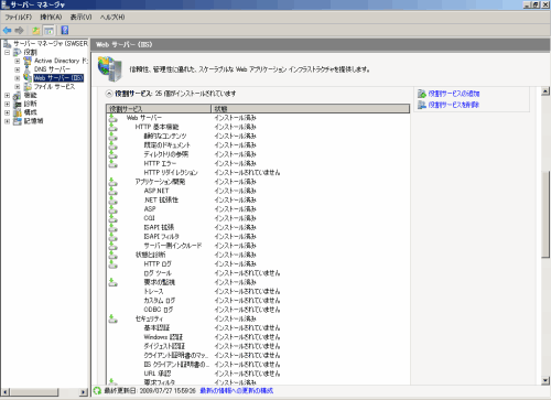 [スタート]メニューから、[プログラム]-[管理ツール]-[サーバマネージャ]を起動し、[役割]-[Webサーバ(IIS)]を選択してください。Webサーバに以下の役割がインストールされていることを確認し、インストールされていなかった場合は、インストールしてください。