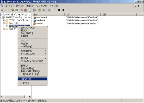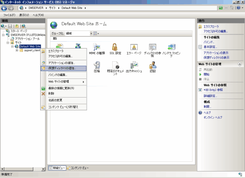 [Default Web Site]画面で一覧を右クリックし、[仮想ディレクトリの追加]を選択して、仮想ディレクトリを追加します。