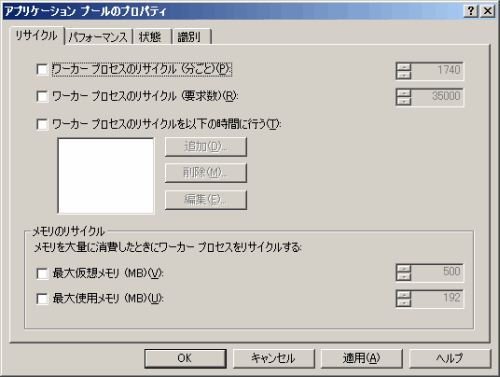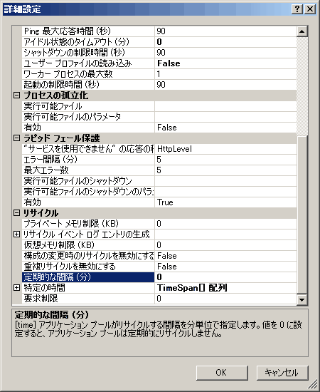 詳細設定の[プロセスモデル]の[アイドル状態のタイムアウト]を“0”、[プロセスモデル]の[ワーカープロセスの最大数]を“1”、[ID]を"NetworkServie"、または"LocalSystem"、[リサイクル]の[定期的な間隔]を“0”に設定し、[OK]ボタンをクリックします。
