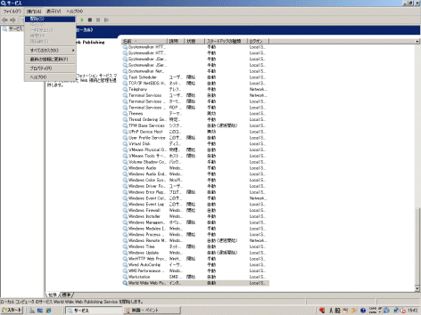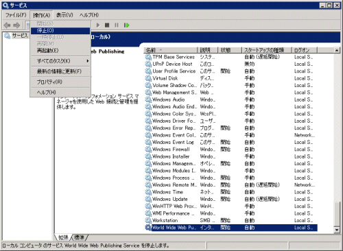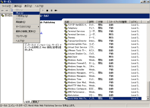 起動されている場合は、[World Wide Web Publishing Service]を選択し、[操作]メニューから[停止]を選択します。