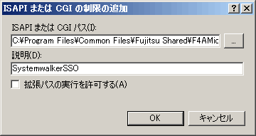 以下の例は、[ISAPIまたはCGIパス]に“%F4AM_INSTALL_PATH%\F4AMidmg\client\F3FMsso\ssoatzag\lib\F3FMssoatziis.dll”を設定し、[説明]に“SystemwalkerSSO”を設定しています。