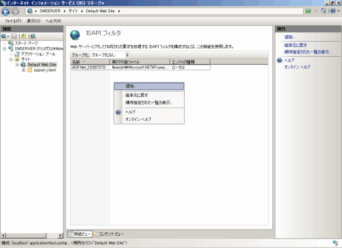 [ISAPIフィルタ]を追加します。[ISAPIフィルタ]画面の一覧を右クリックし、[追加]を選択します。