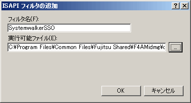 以下の例は、フィルタ名に“SystemwalkerSSO”、実行可能ファイルに“%F4AM_INSTALL_PATH%\F4AMidmg\client\F3FMsso\ssoatzag\lib\F3FMSSOatziis.dll”を設定しています。設定後[OK]ボタンを選択します。