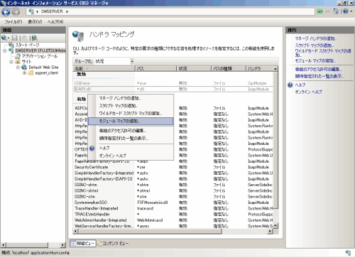 [モジュールマップ]を追加します。[ハンドラマッピング]画面の一覧を右クリックし、[モジュールマップの追加]を選択します。