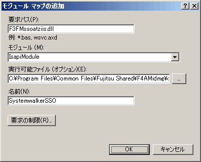 [要求パス]に“F3FMssoatziis.dll”、[モジュール]に“IsapiModule”、[実行可能ファイル]にSystemwalkerシングル・サインオンエージェントのプログラムの絶対パスを設定します。