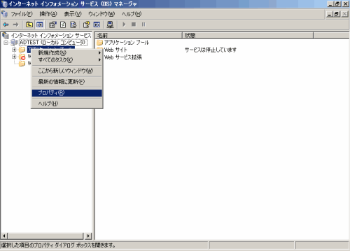 [スタート]メニューで[プログラム]-[管理ツール]-[インターネット インフォメーション サービス(IIS)マネージャ]を選択します。