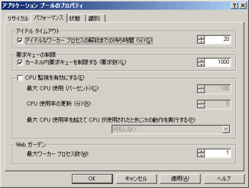 プロパティシートの[パフォーマンス]タブを選択し、[Webガーデン]の[最大ワーカープロセス数]に“1”を設定します。