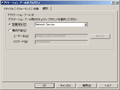 プロパティシートの[識別]タブを選択し、[アプリケーション プールID]に“Network Service”、または“Local System”を設定します。以下の例は、“Network Service”を設定しています。設定終了後、[OK]ボタンをクリックします。