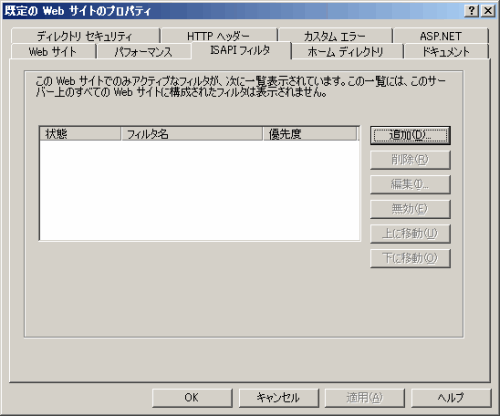 プロパティを選択してプロパティシートを開きます。プロパティシートの[ISAPIフィルタ]タブを選択して[追加]ボタンをクリックします。