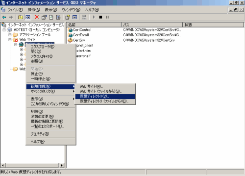 [新規作成]-[仮想ディレクトリ]を選択し、仮想ディレクトリの作成ウィザード画面を表示します。