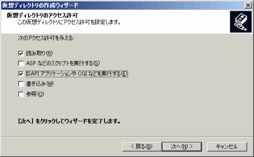 仮想ディレクトリのアクセス許可に読み取り権と、ISAPIアプリケーションの実行権を設定します。