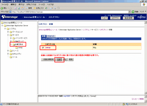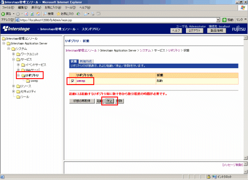 6. [Interstage 管理コンソール]で、[システム]-[サービス]-[リポジトリ]を選択します。